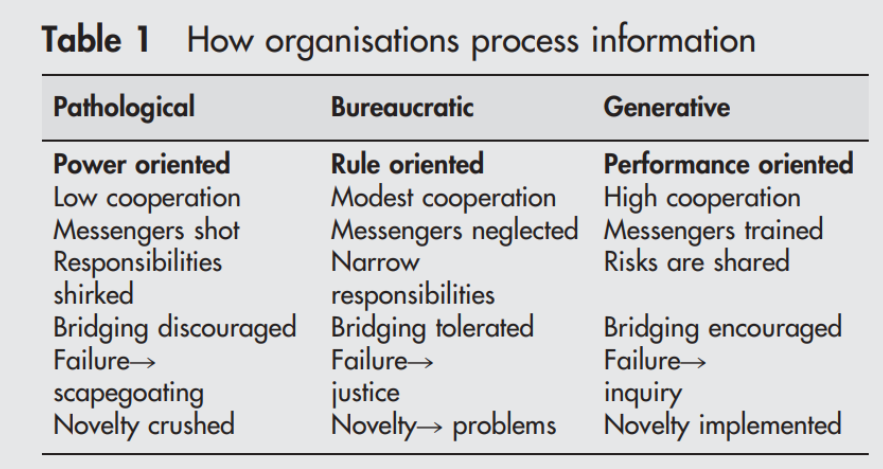 The Westrum typology of organization cultures identifies these broad categorizations of culture – pathological, bureaucratic and generative.1